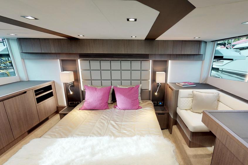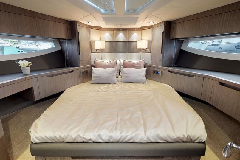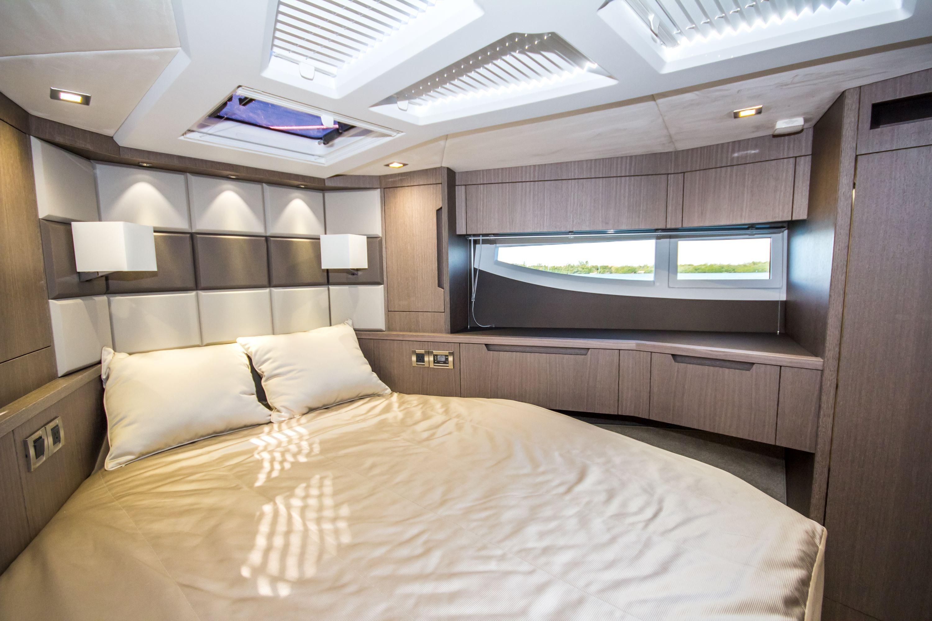 Serve refreshments straight from the galley or even set up an outside bar to your guests’ amazement. Down below, three cabins and two bathrooms await the passengers for a total of six berths. The master cabin, located midship, offers a double bed, a large wardrobe and a private bathroom. Offer your guests the bow VIP cabin for spectacular night views thanks to a series of skylights. The double guest cabin can be turned into a study, a wardrobe or an additional leisure area. Experience the power of innovation and the intense character of the amazing 510 Skydeck!