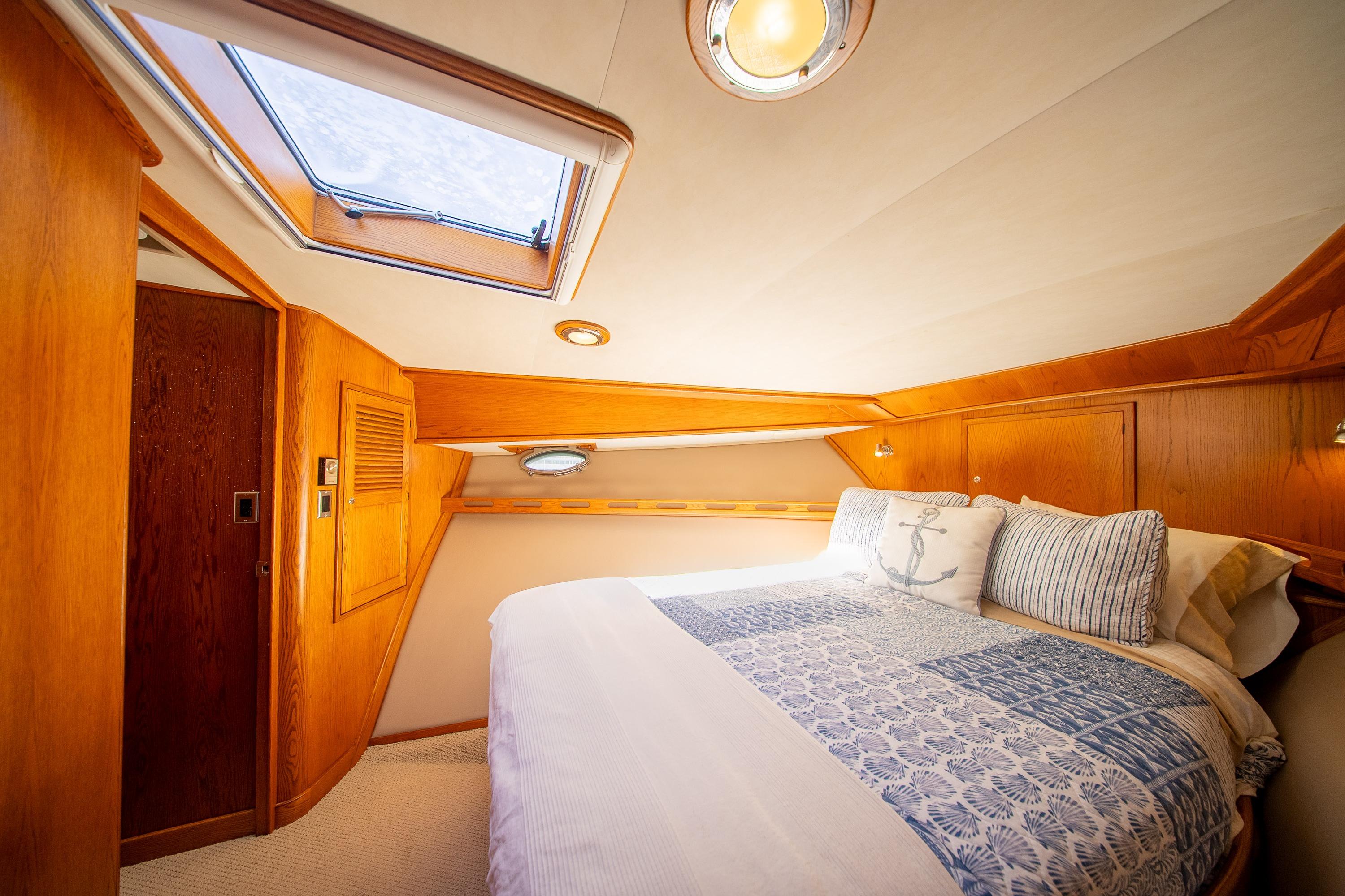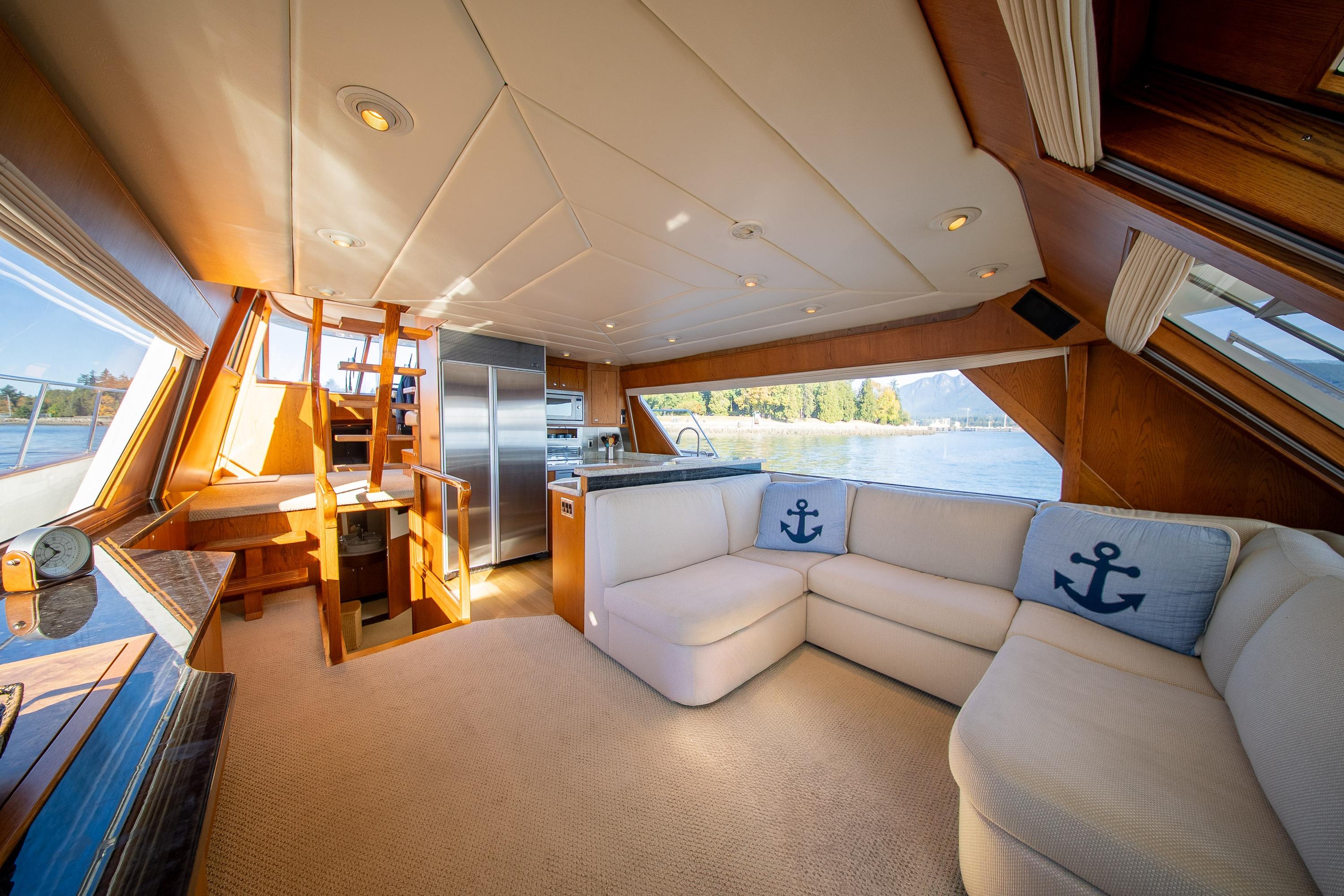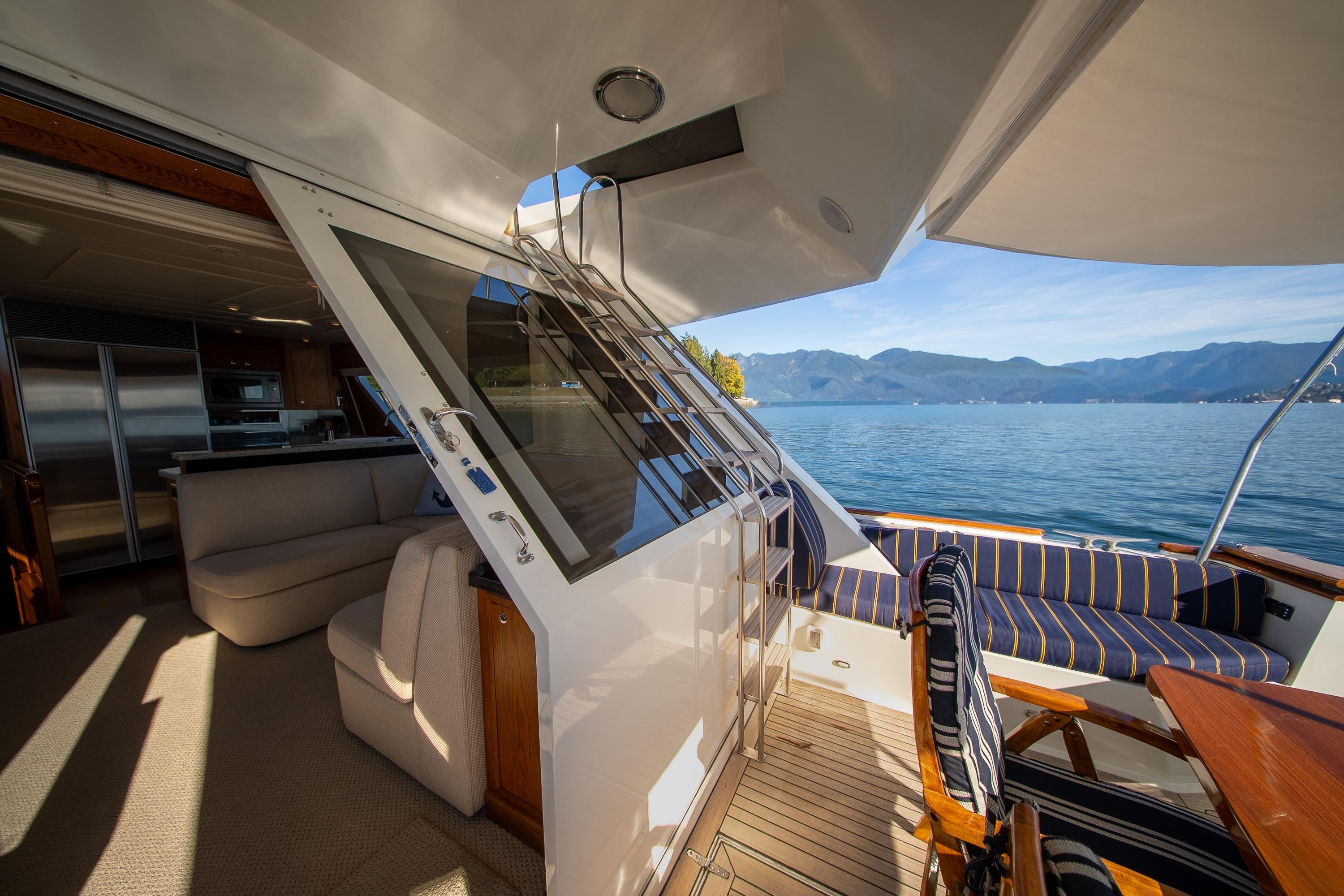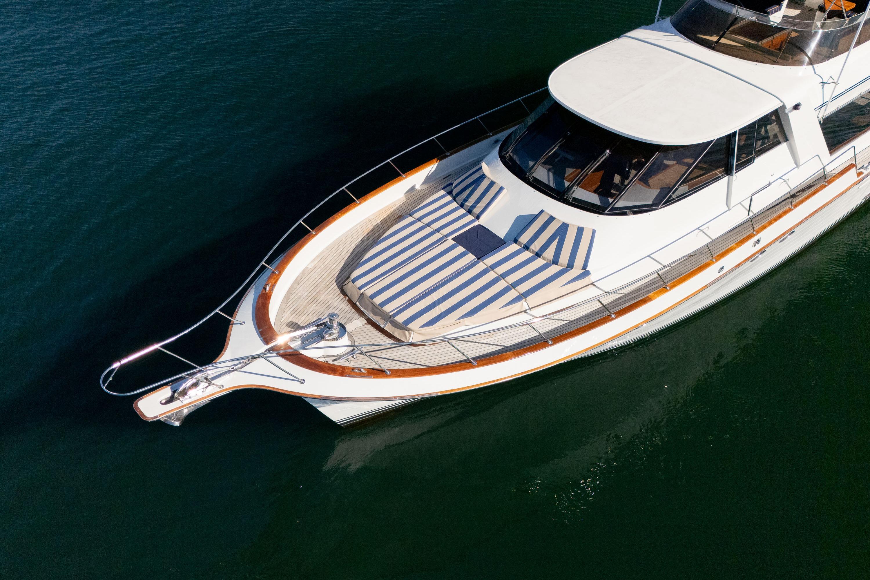 Her desirable pilothouse layout featuring 3 staterooms,  including the Owner's Suite with private access, open galley, and exterior entertaining space on the flying bridge, aft deck and foredeck sun pad.