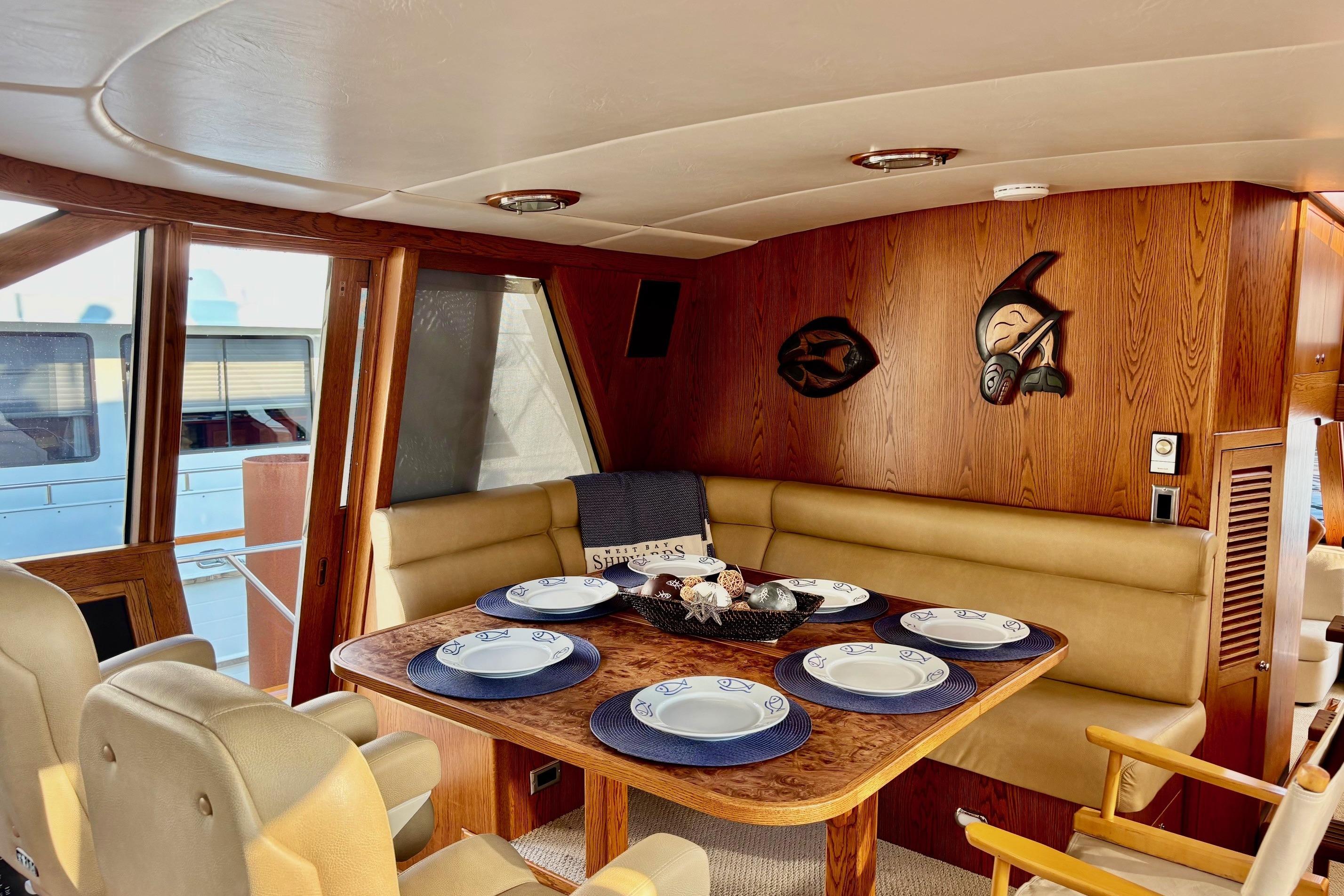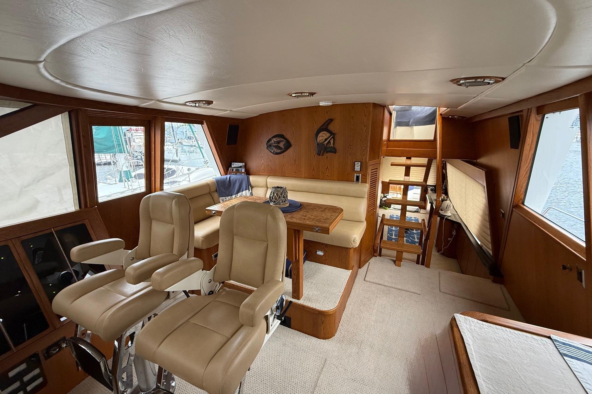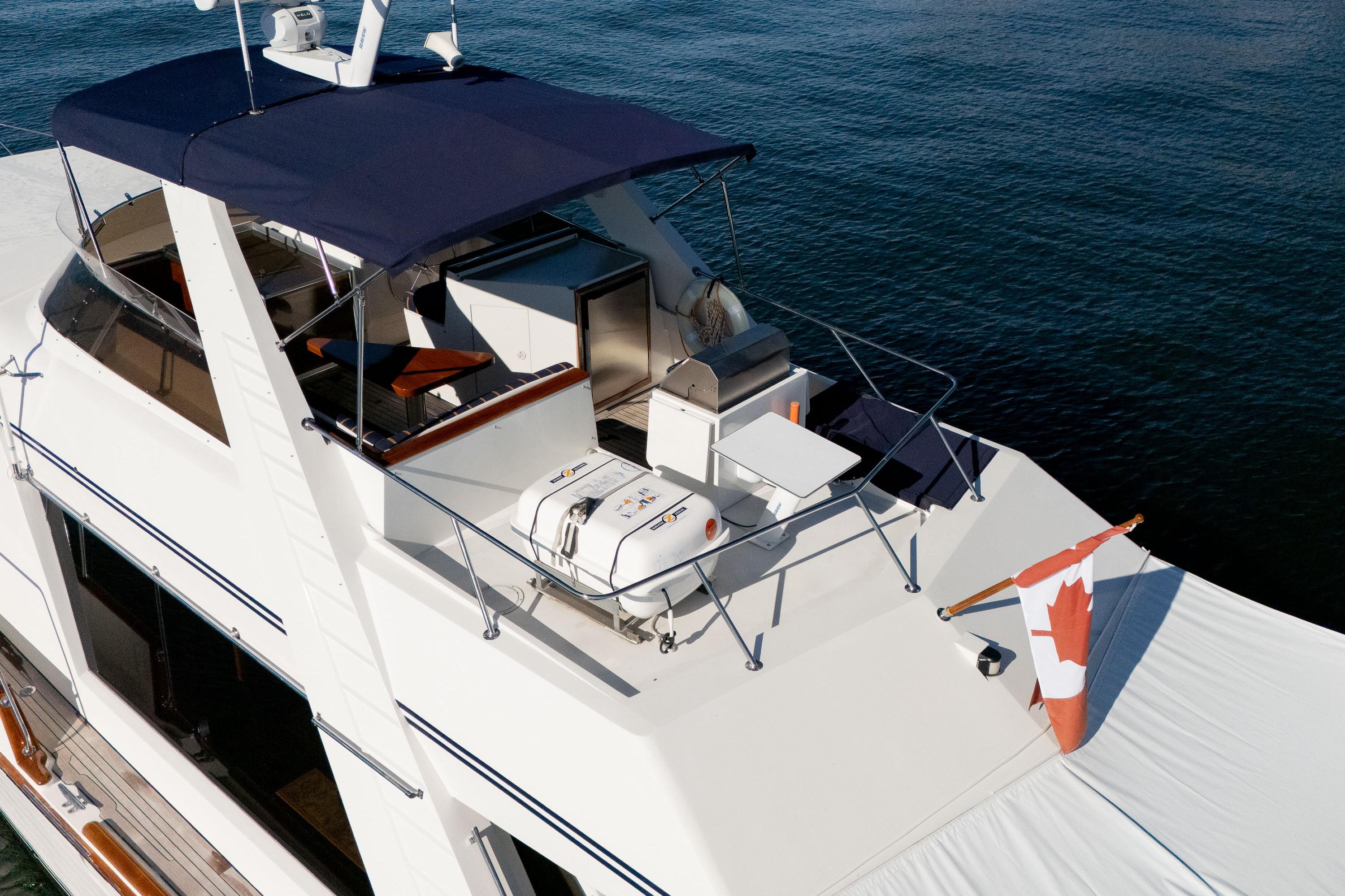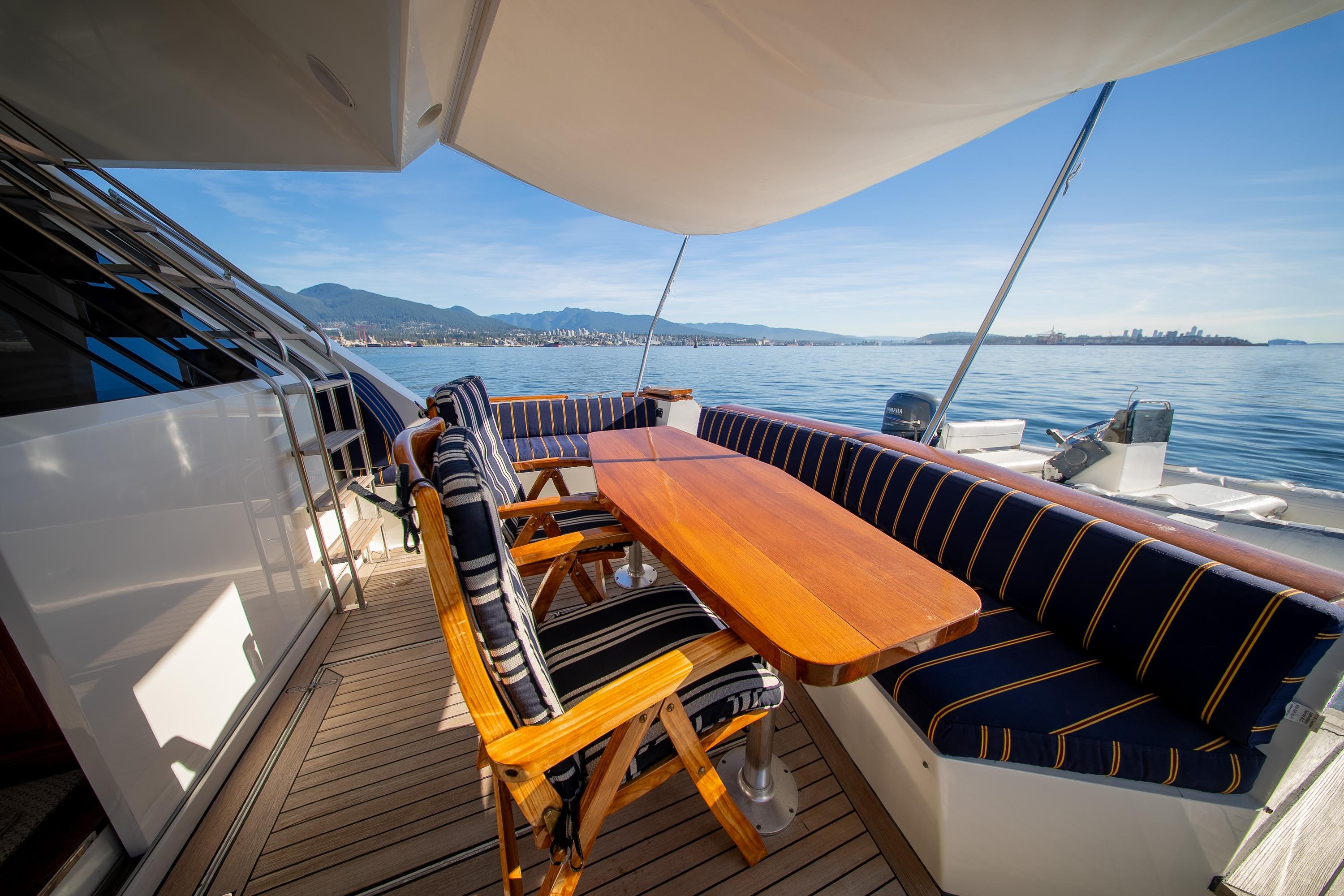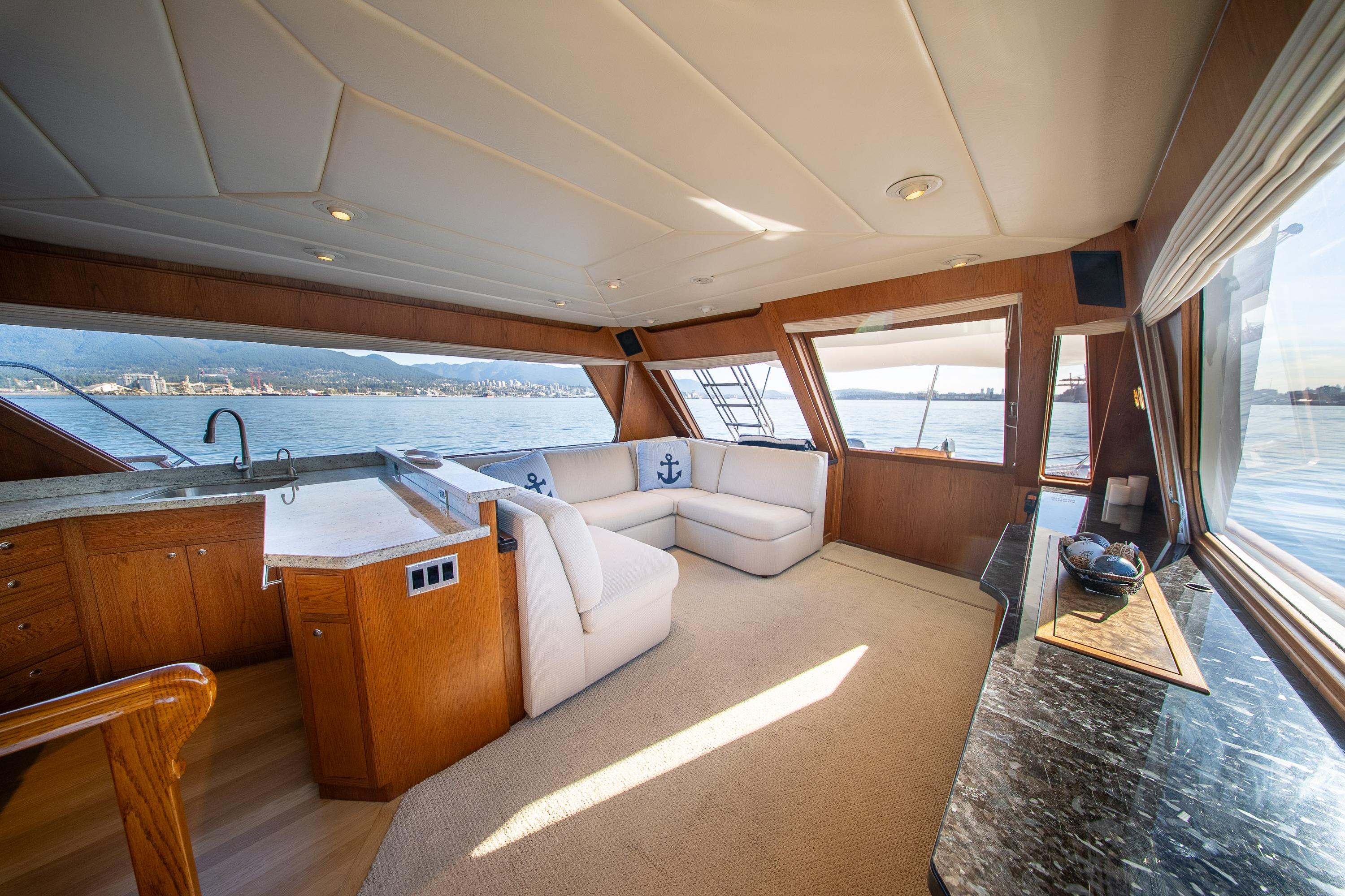 Her desirable pilothouse layout featuring 3 staterooms,  including the Owner's Suite with private access, open galley, and exterior entertaining space on the flying bridge, aft deck and foredeck sun pad.