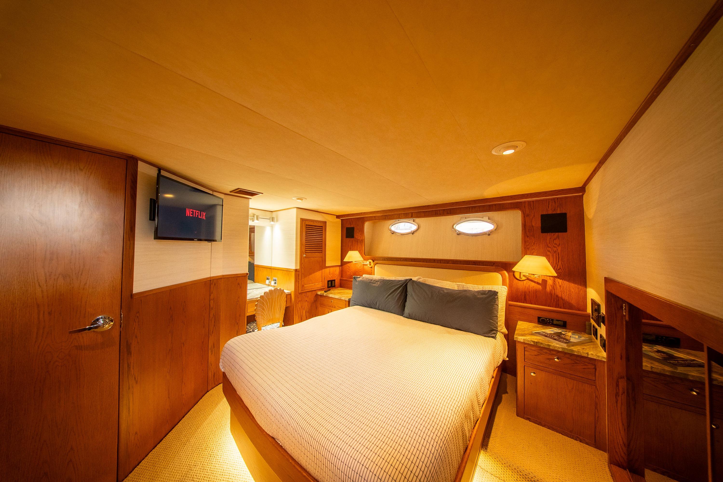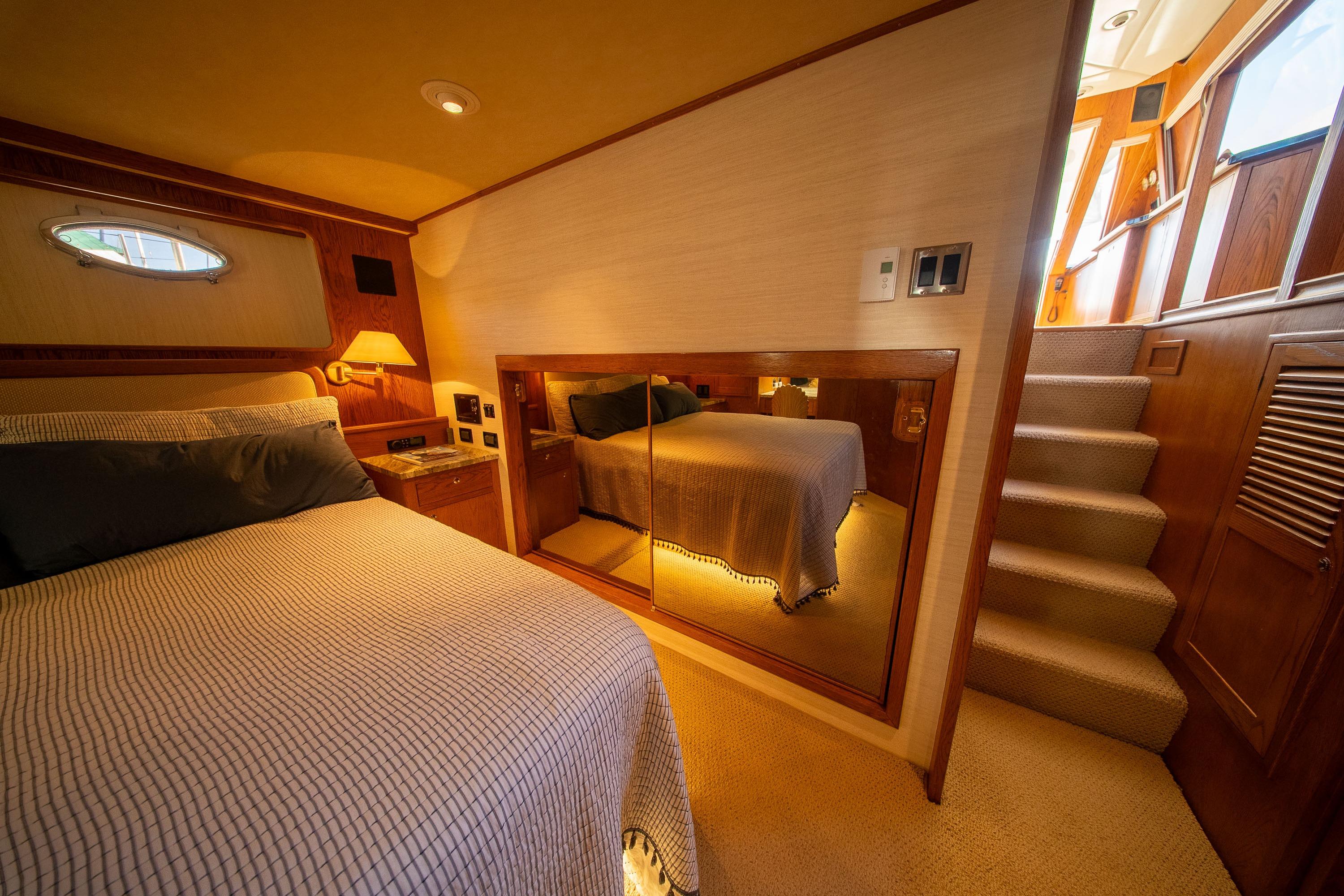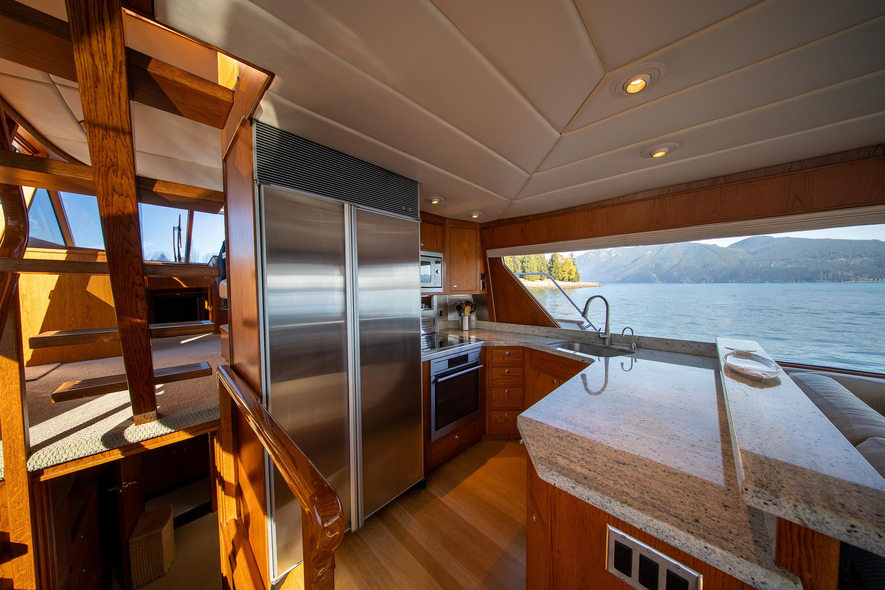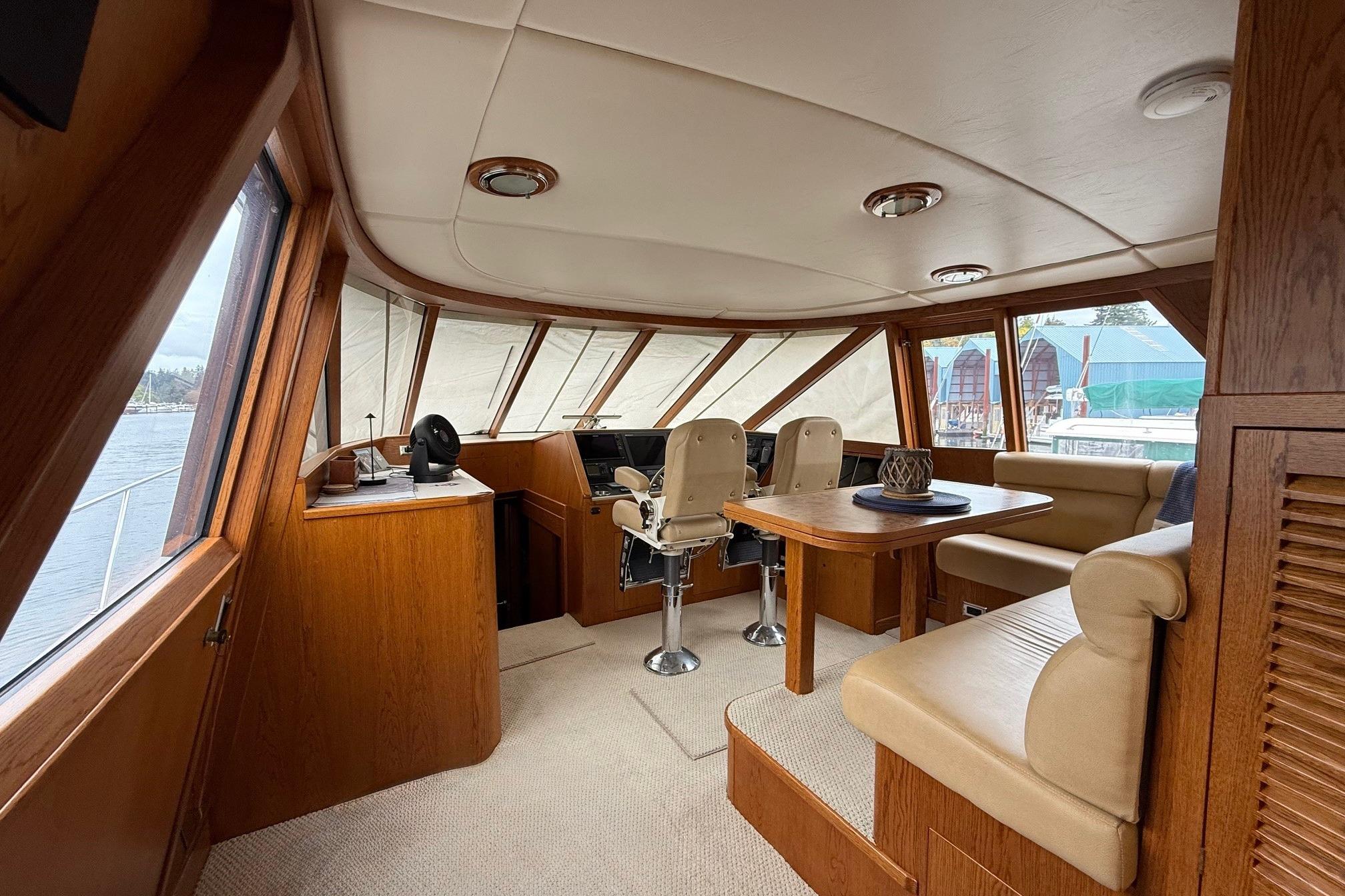 Her desirable pilothouse layout featuring 3 staterooms,  including the Owner's Suite with private access, open galley, and exterior entertaining space on the flying bridge, aft deck and foredeck sun pad.