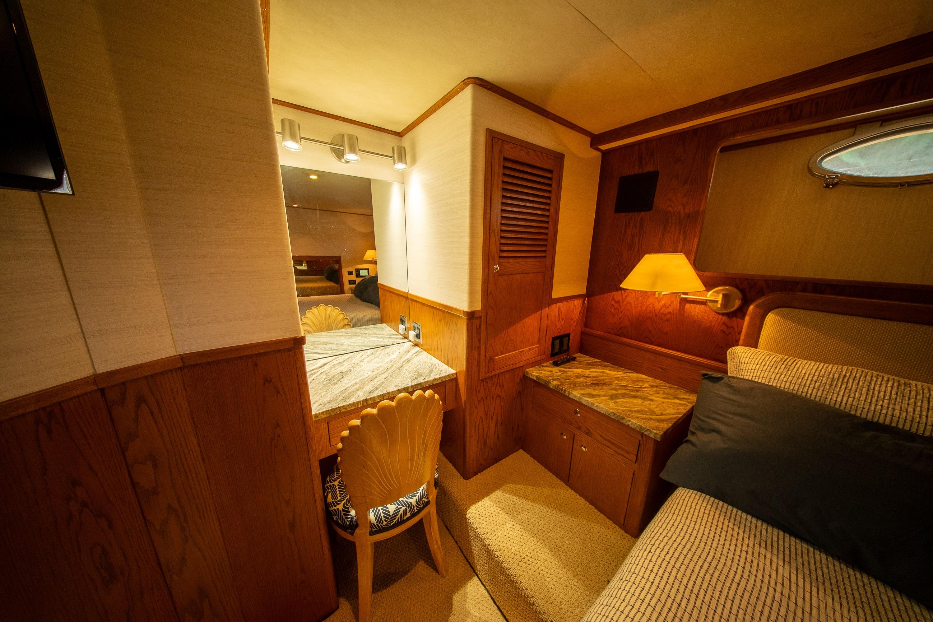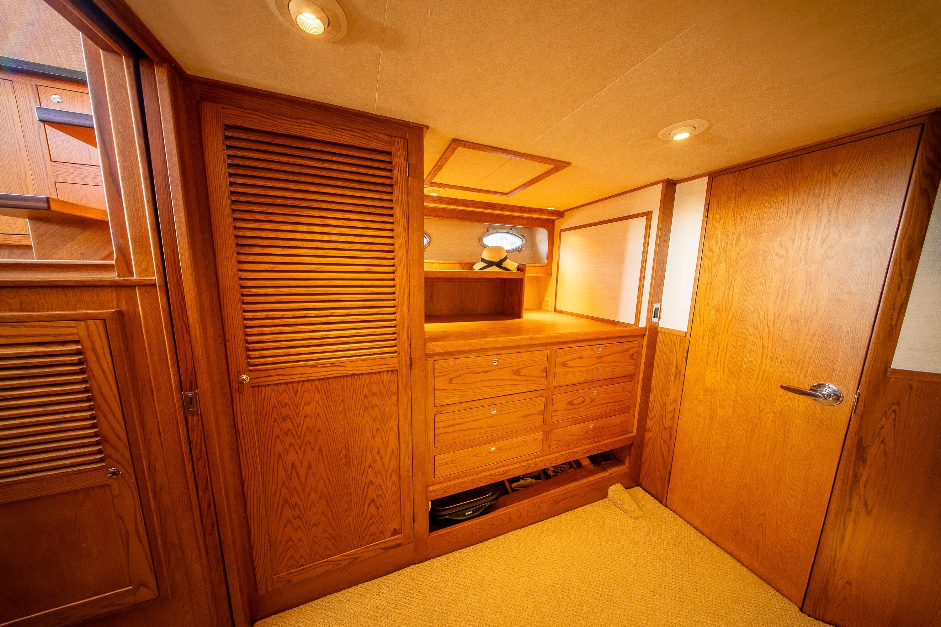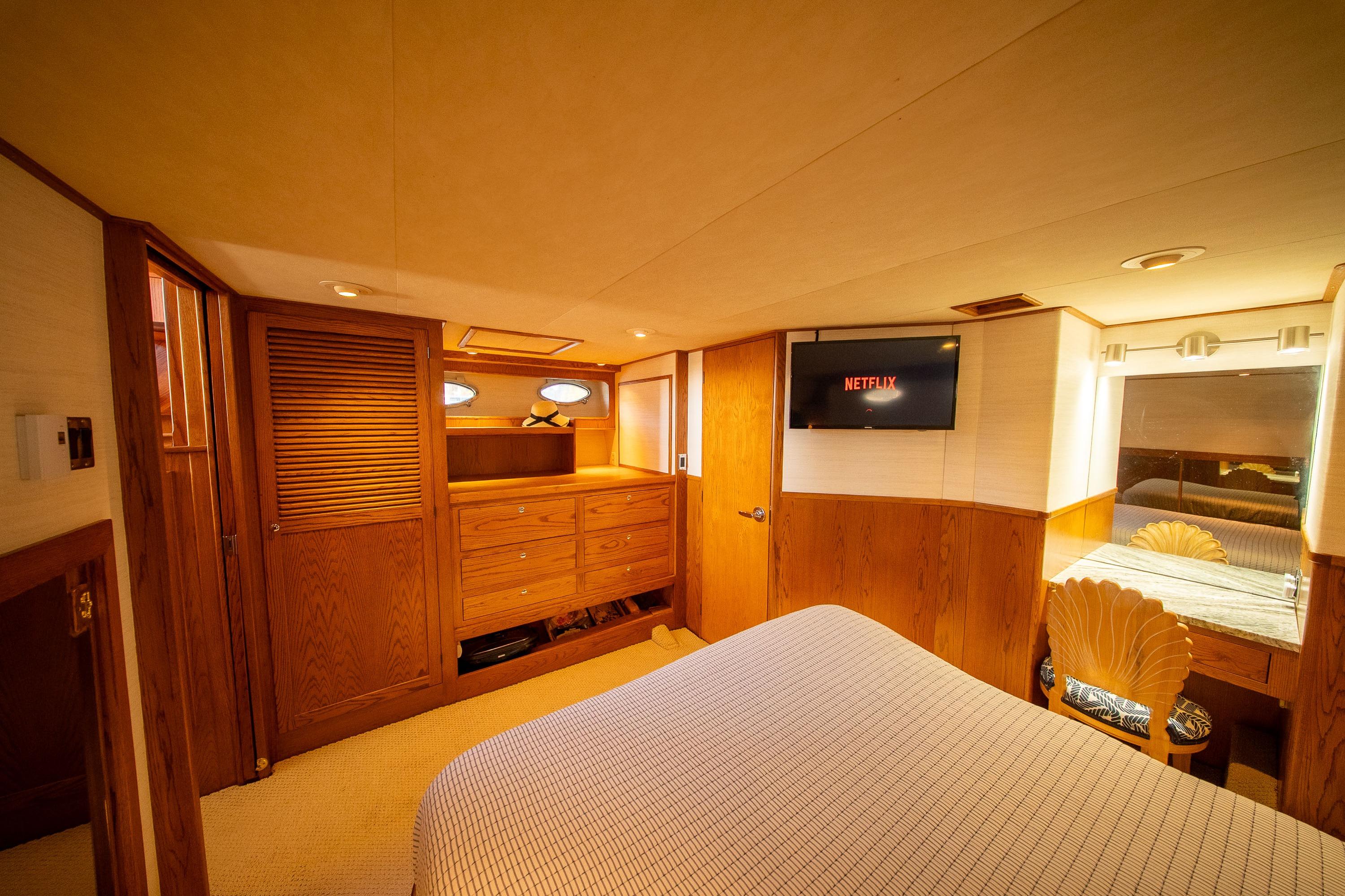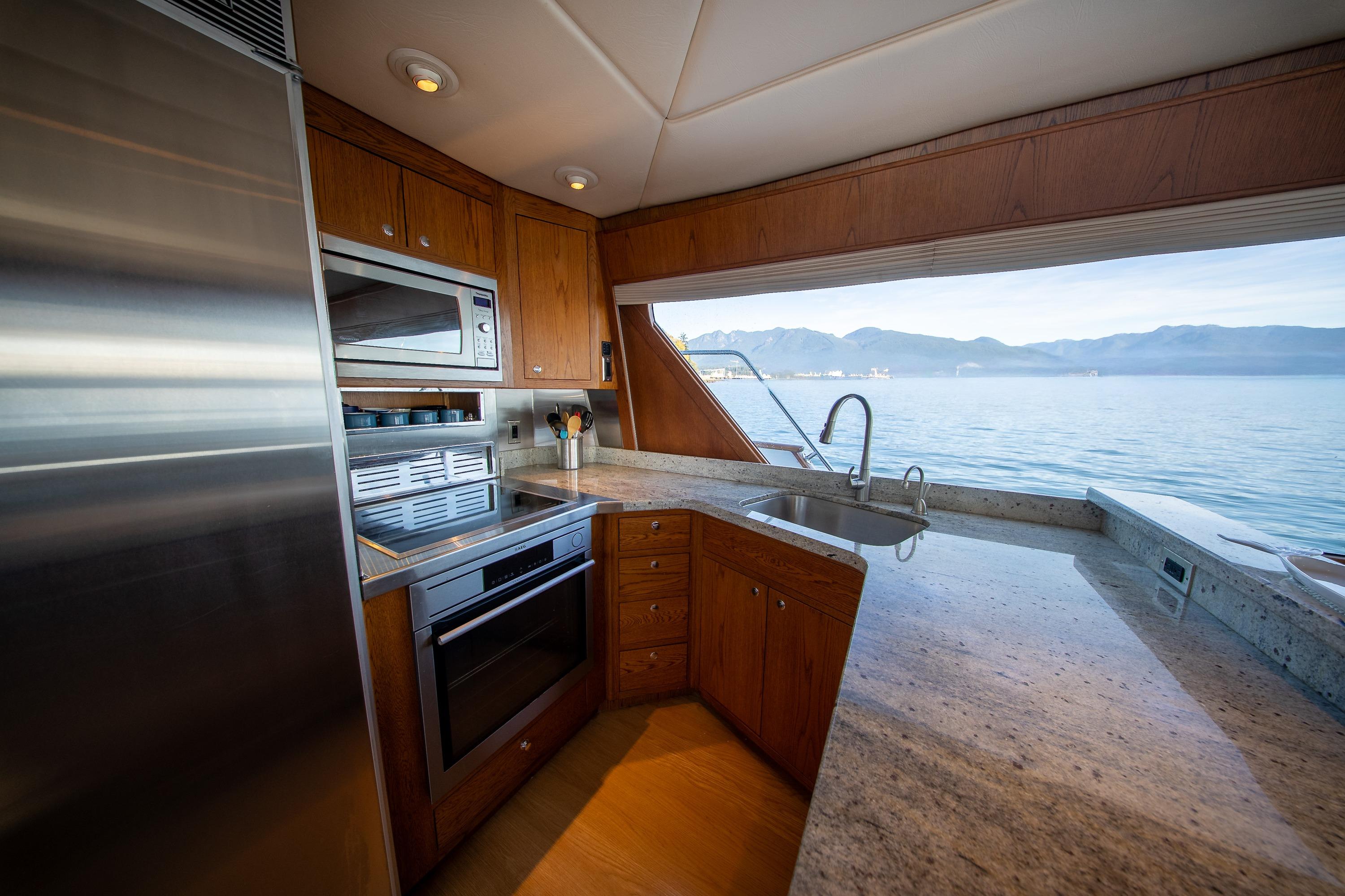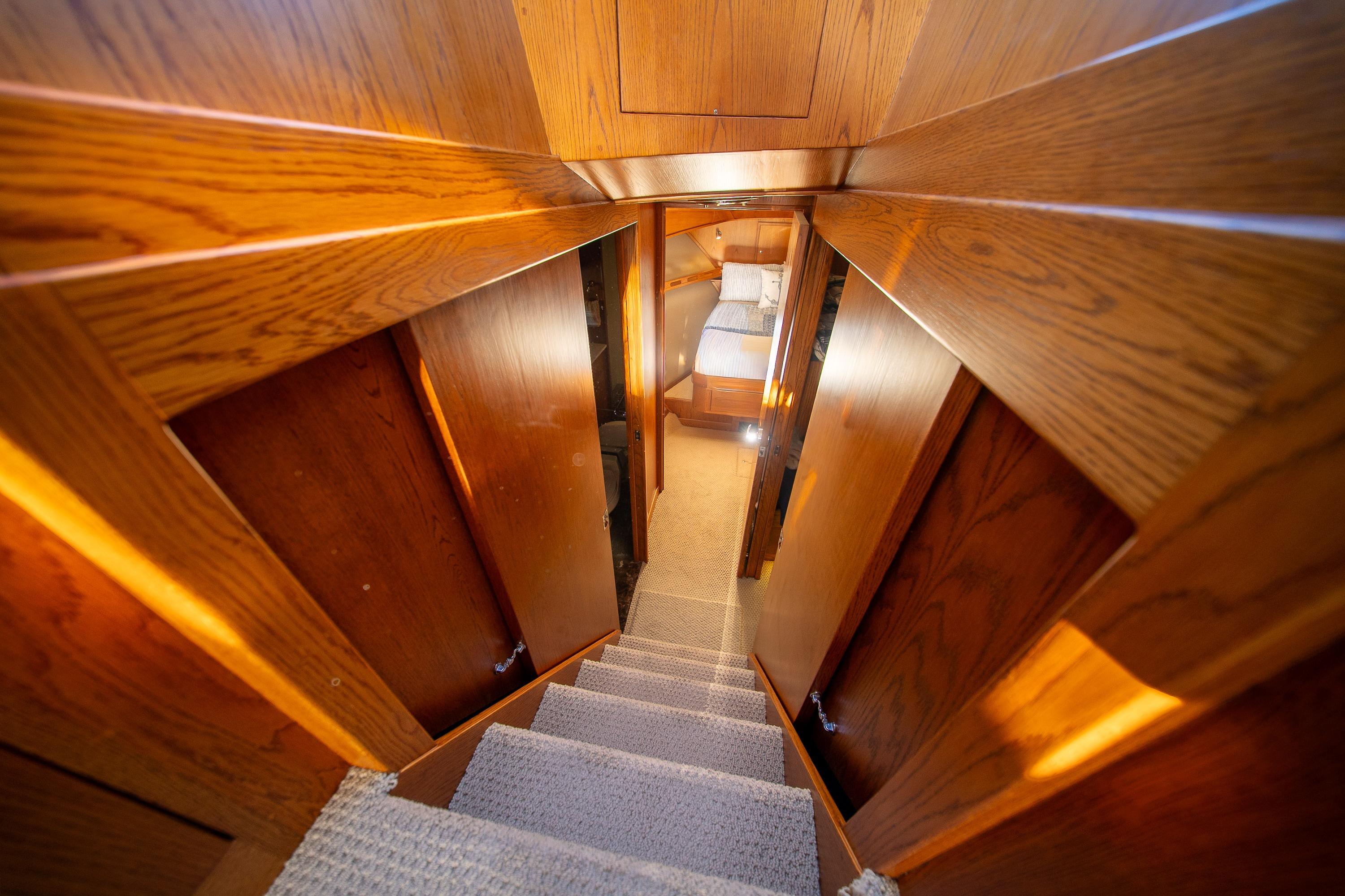Her desirable pilothouse layout featuring 3 staterooms,  including the Owner's Suite with private access, open galley, and exterior entertaining space on the flying bridge, aft deck and foredeck sun pad.