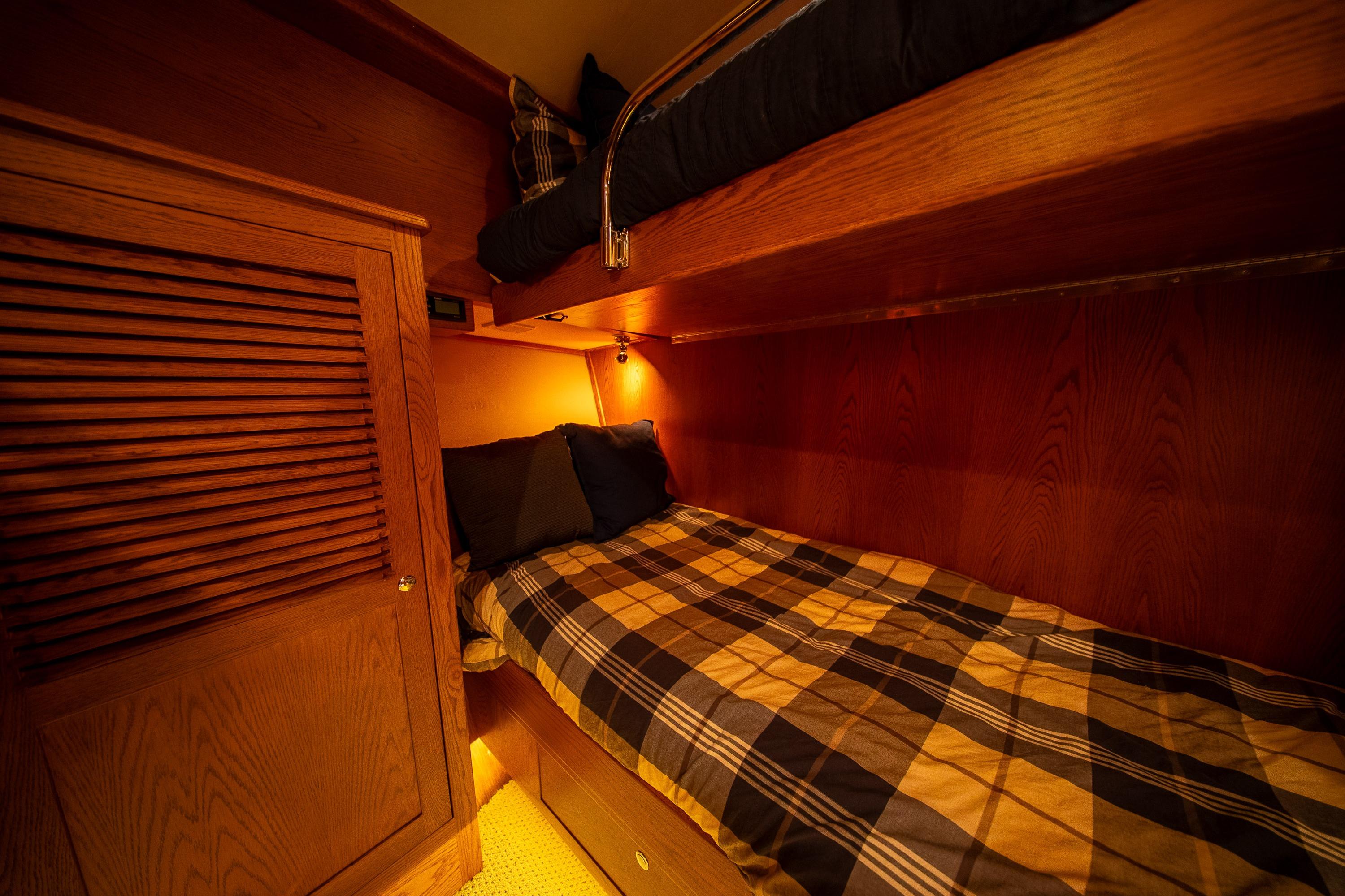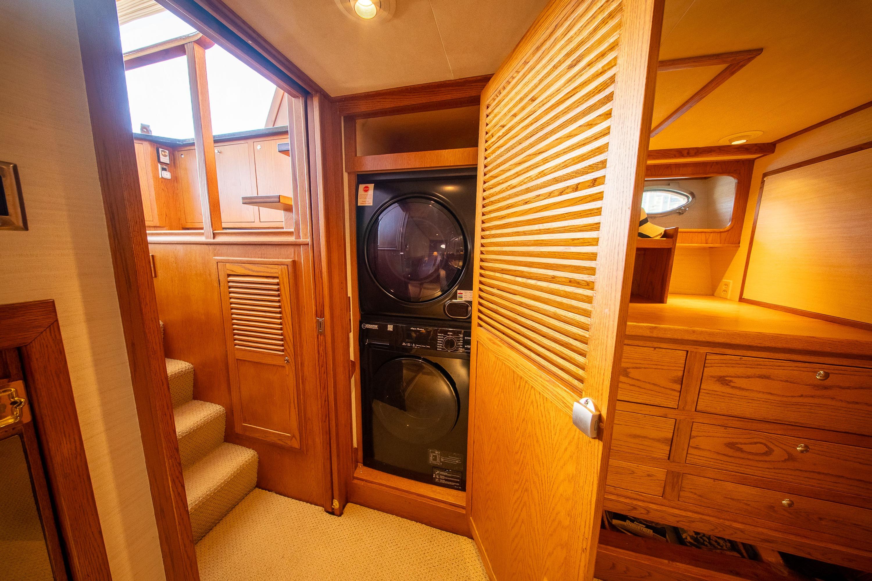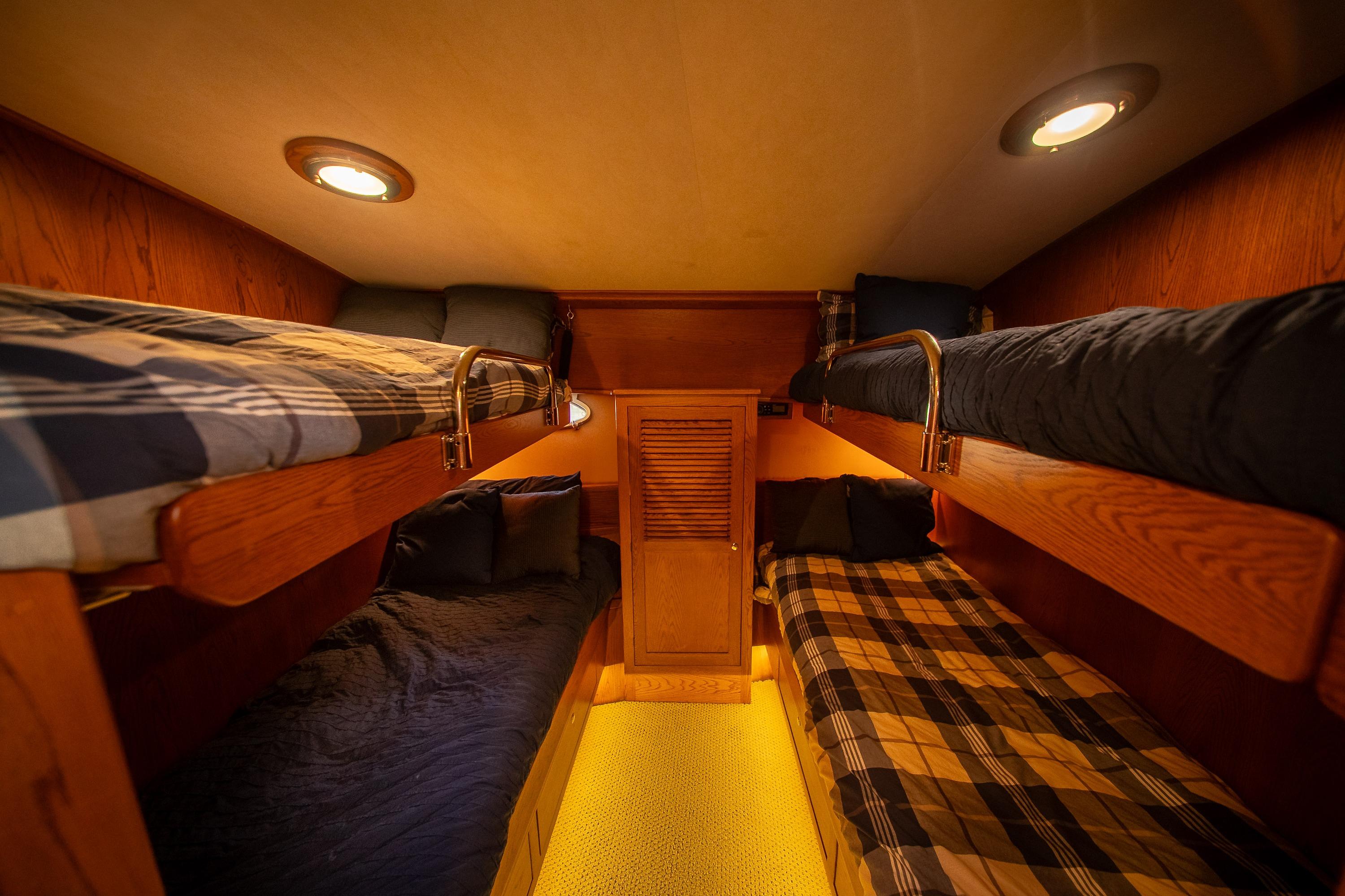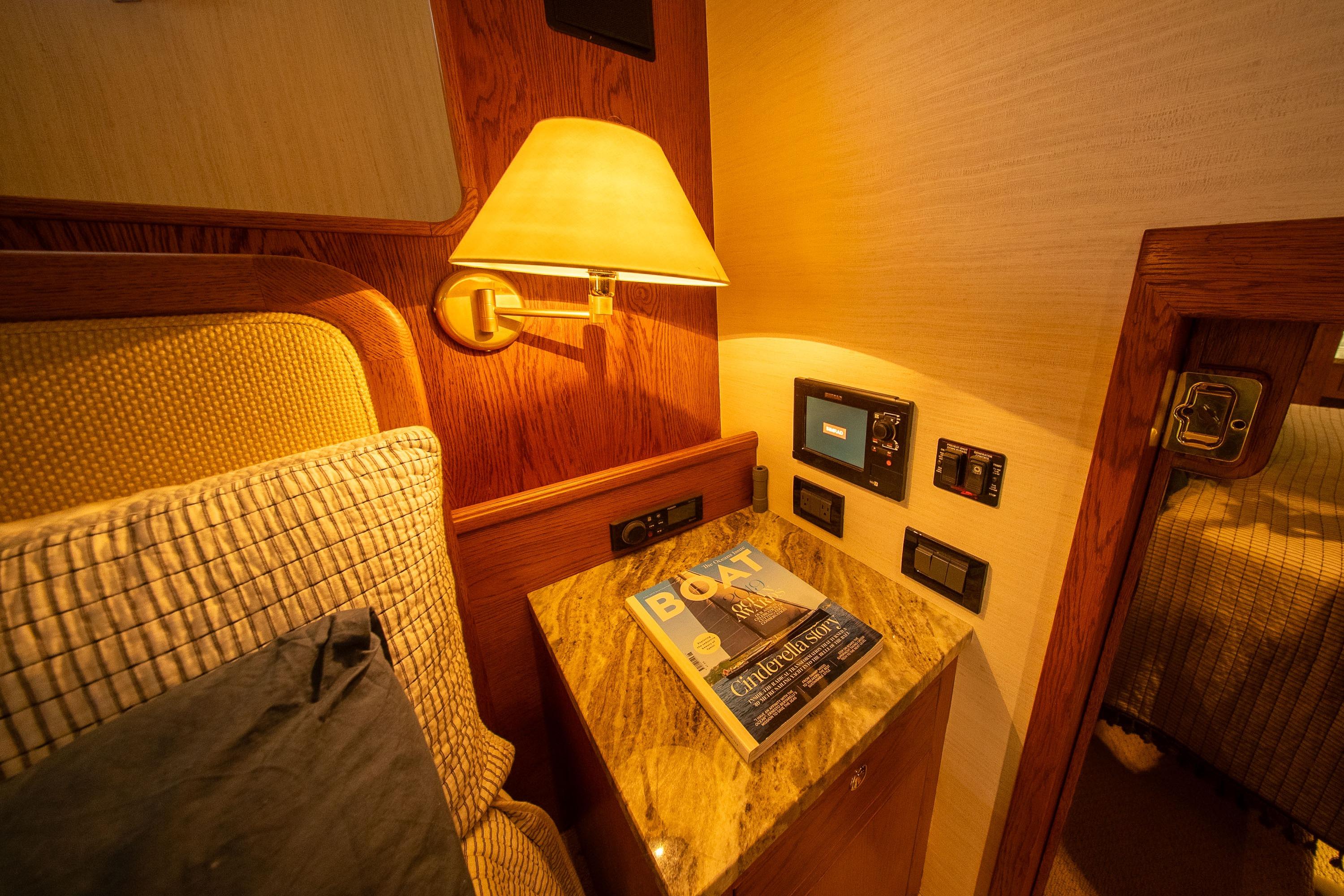 Her desirable pilothouse layout featuring 3 staterooms,  including the Owner's Suite with private access, open galley, and exterior entertaining space on the flying bridge, aft deck and foredeck sun pad.