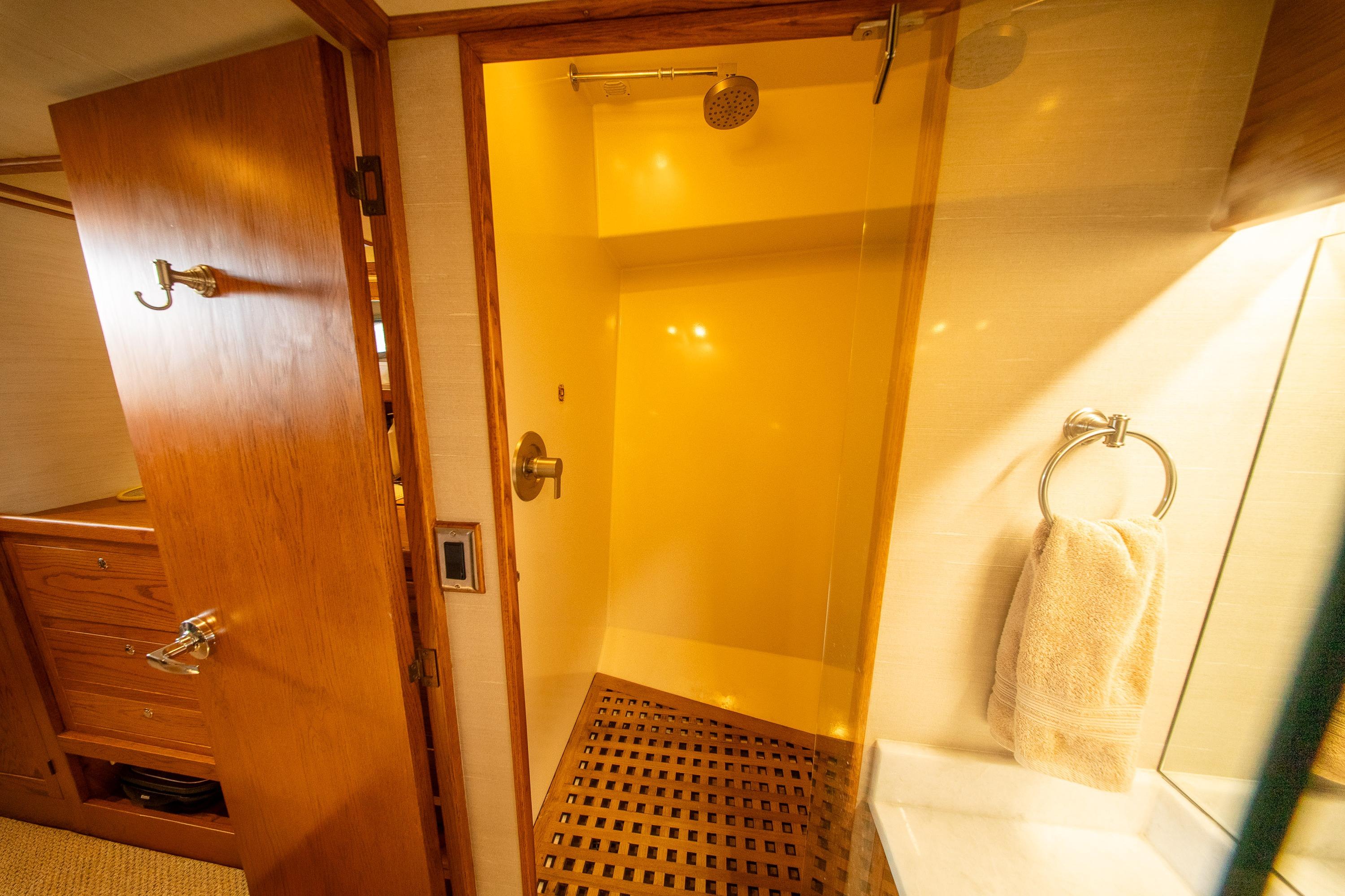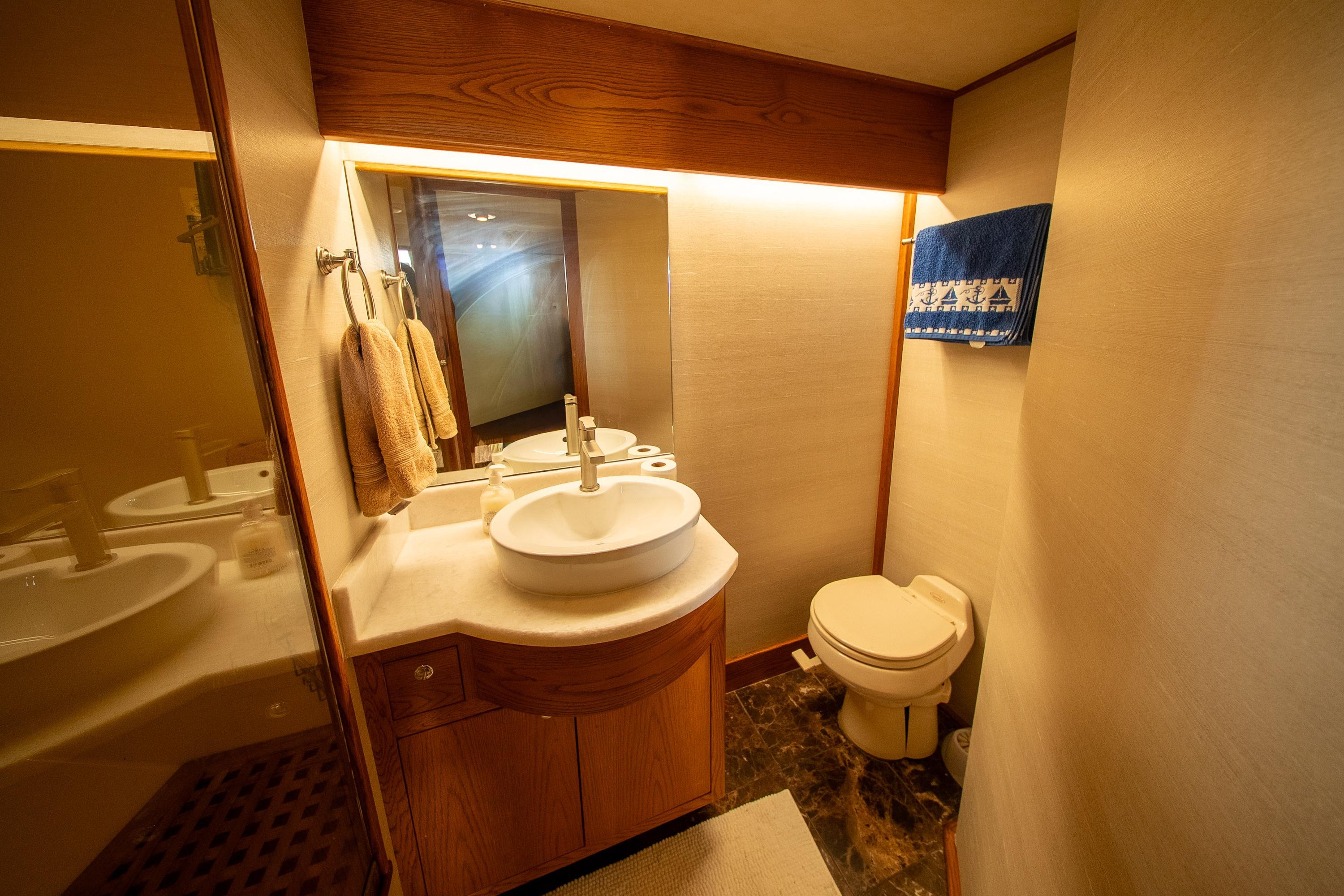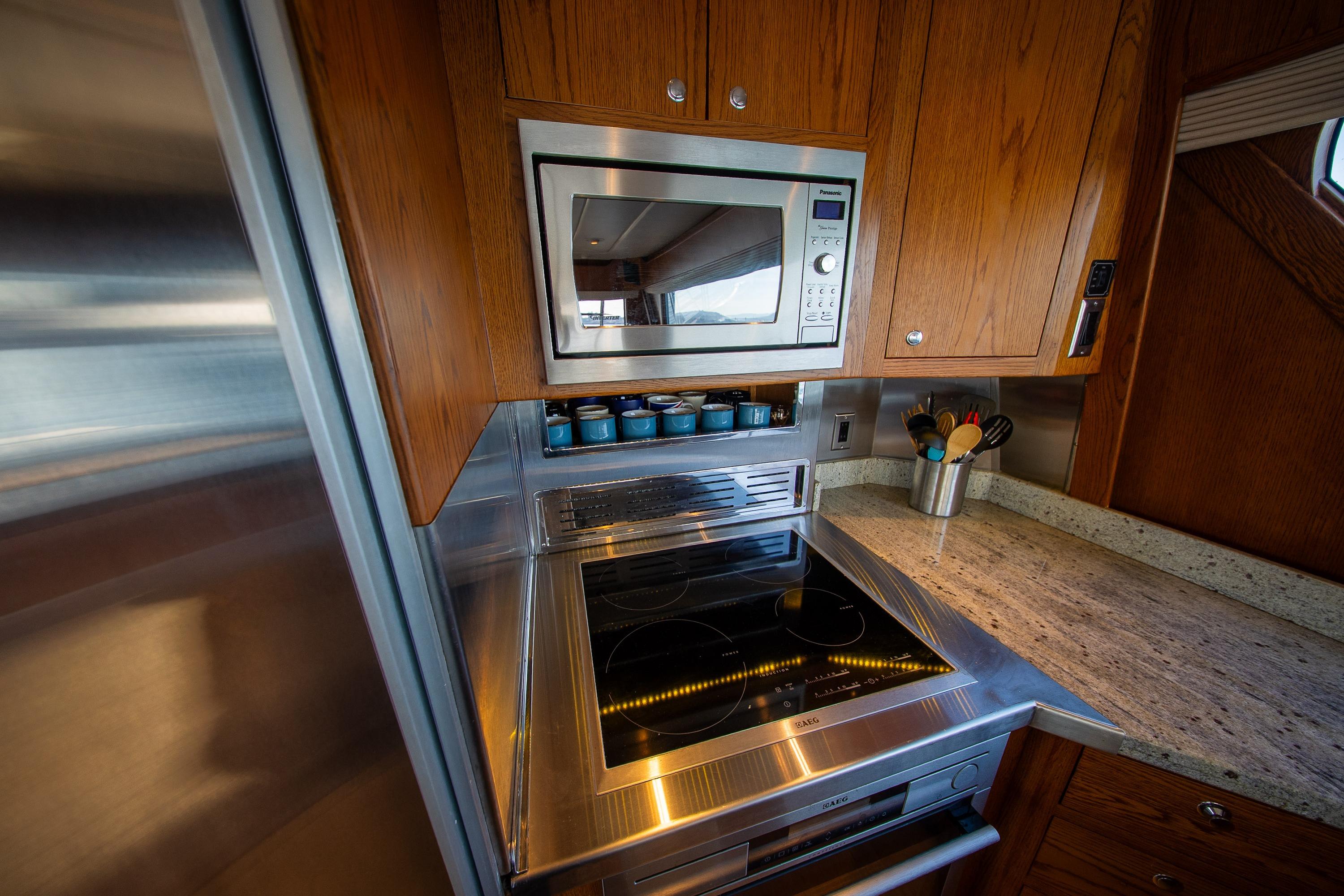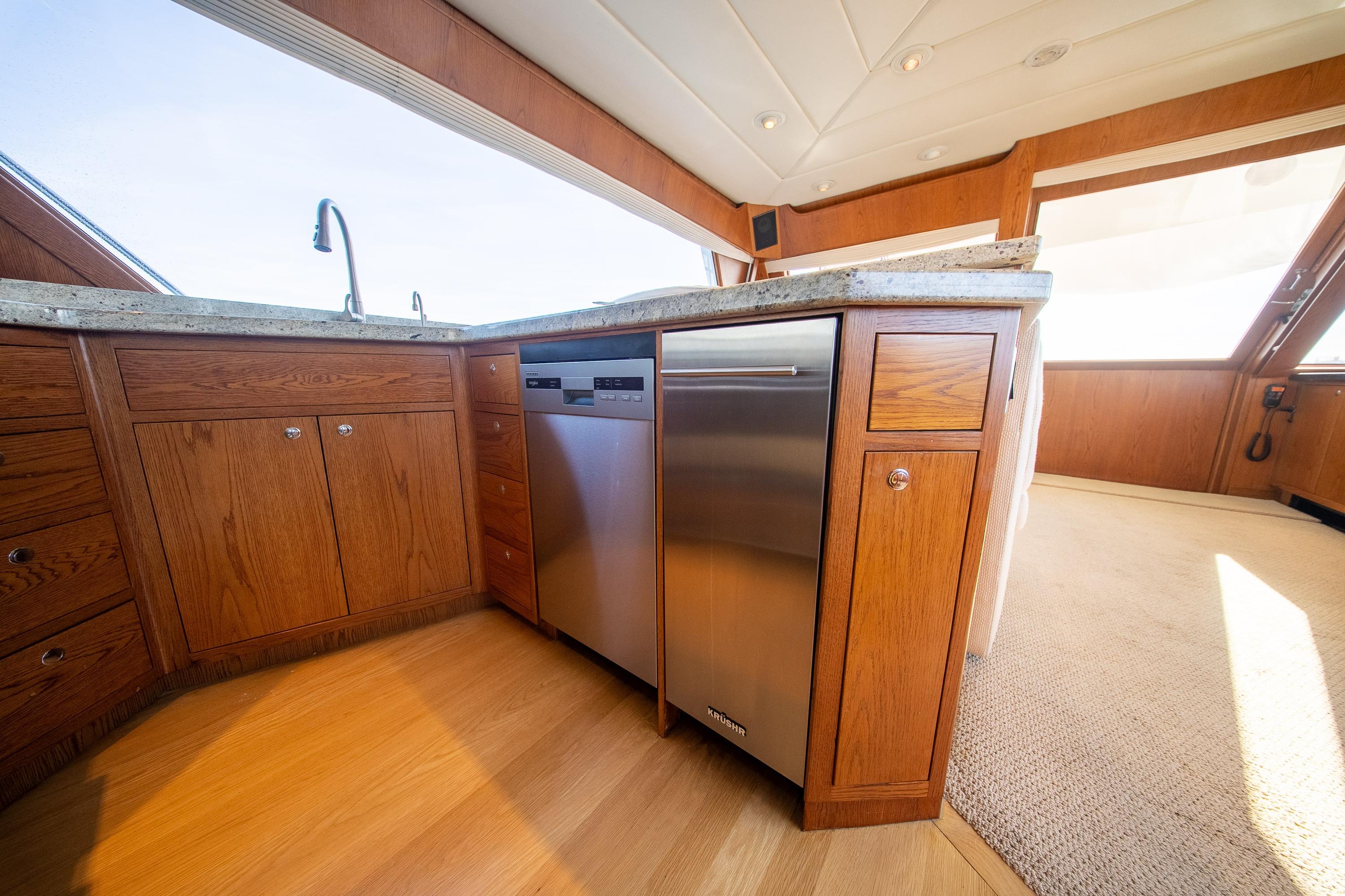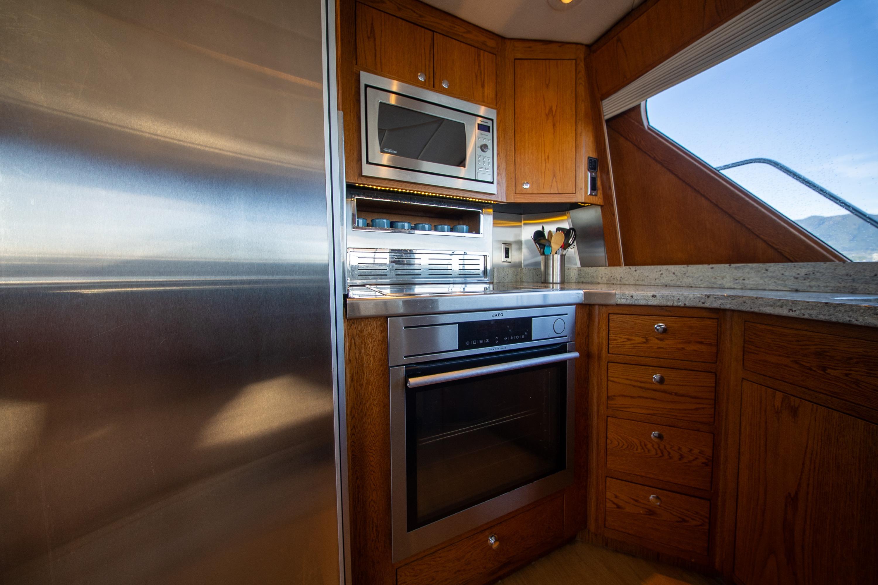 Her desirable pilothouse layout featuring 3 staterooms,  including the Owner's Suite with private access, open galley, and exterior entertaining space on the flying bridge, aft deck and foredeck sun pad.